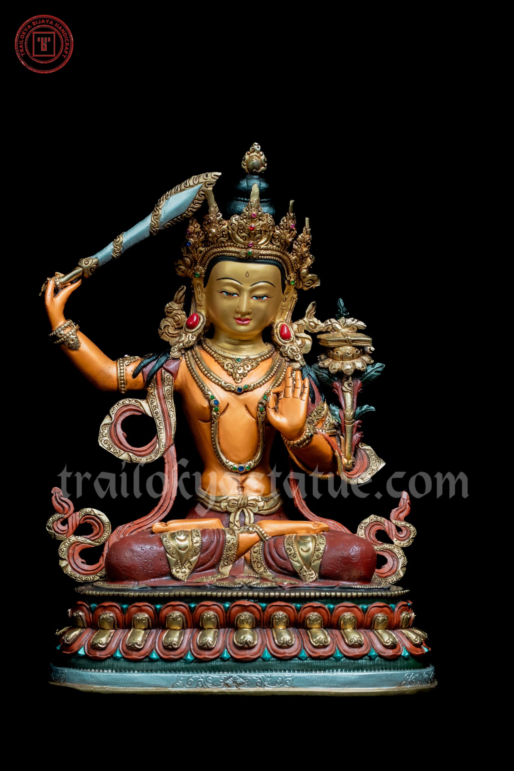 Colored Manjushri holding a flaming sword of wisdom and a scripture